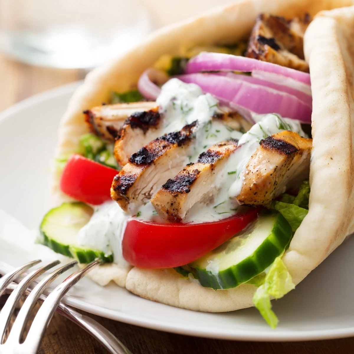 Succulent chicken pieces marinated in lemon, garlic, and Mediterranean spices, then grilled to perfection and nestled inside soft pita bread. Cool cucumber tzatziki balances the charred, savory meat while crisp tomatoes, red onion, and lettuce add refreshing crunch.