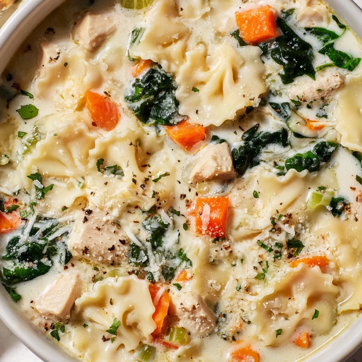 This comforting Italian-American soup transforms classic white lasagna into a bowl-ready format. Tender pieces of chicken breast simmer with aromatic vegetables—onions, carrots, celery, and garlic—in a flavorful chicken broth seasoned with dried Italian herbs and optional red pepper flakes for gentle warmth. Broken lasagna noodles cook directly in the broth, absorbing the savory flavors while reaching perfect al dente texture. Fresh spinach adds vibrant color and nutrition. The finishing touch creates irresistible creaminess: heavy cream blended with ricotta, mozzarella, and Parmesan cheeses melt into the broth, creating a luxuriously smooth, cheesy base. Fresh parsley brightens each serving. Ready in just 50 minutes, this soup delivers all the comforting flavors of white lasagna in a fraction of the time.