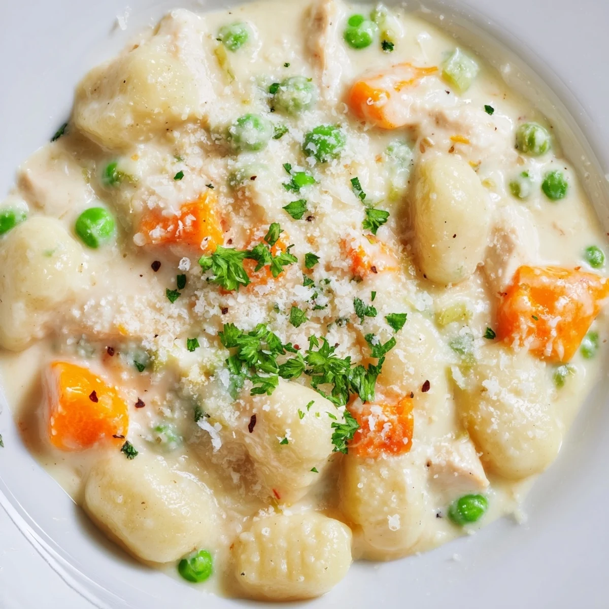 This satisfying one-pot dinner brings together tender shredded chicken, soft potato gnocchi, and classic pot pie vegetables in a rich, creamy sauce. The entire dish cooks together in just 45 minutes, making it perfect for busy weeknights when you want something hearty and comforting.