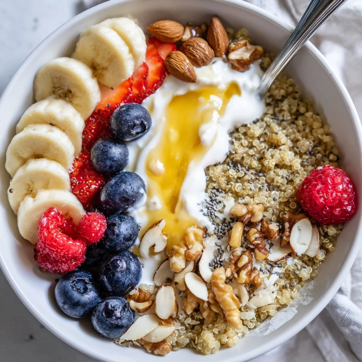 This nourishing quinoa breakfast bowl combines fluffy cooked quinoa with creamy Greek or plant-based yogurt, fresh berries, banana and a drizzle of honey or maple syrup. Cook quinoa in 12-15 minutes, fluff and cool slightly, then assemble with nuts, chia seeds and coconut. Swap fruits or nut butter for variety, and store leftovers refrigerated up to 2 days.